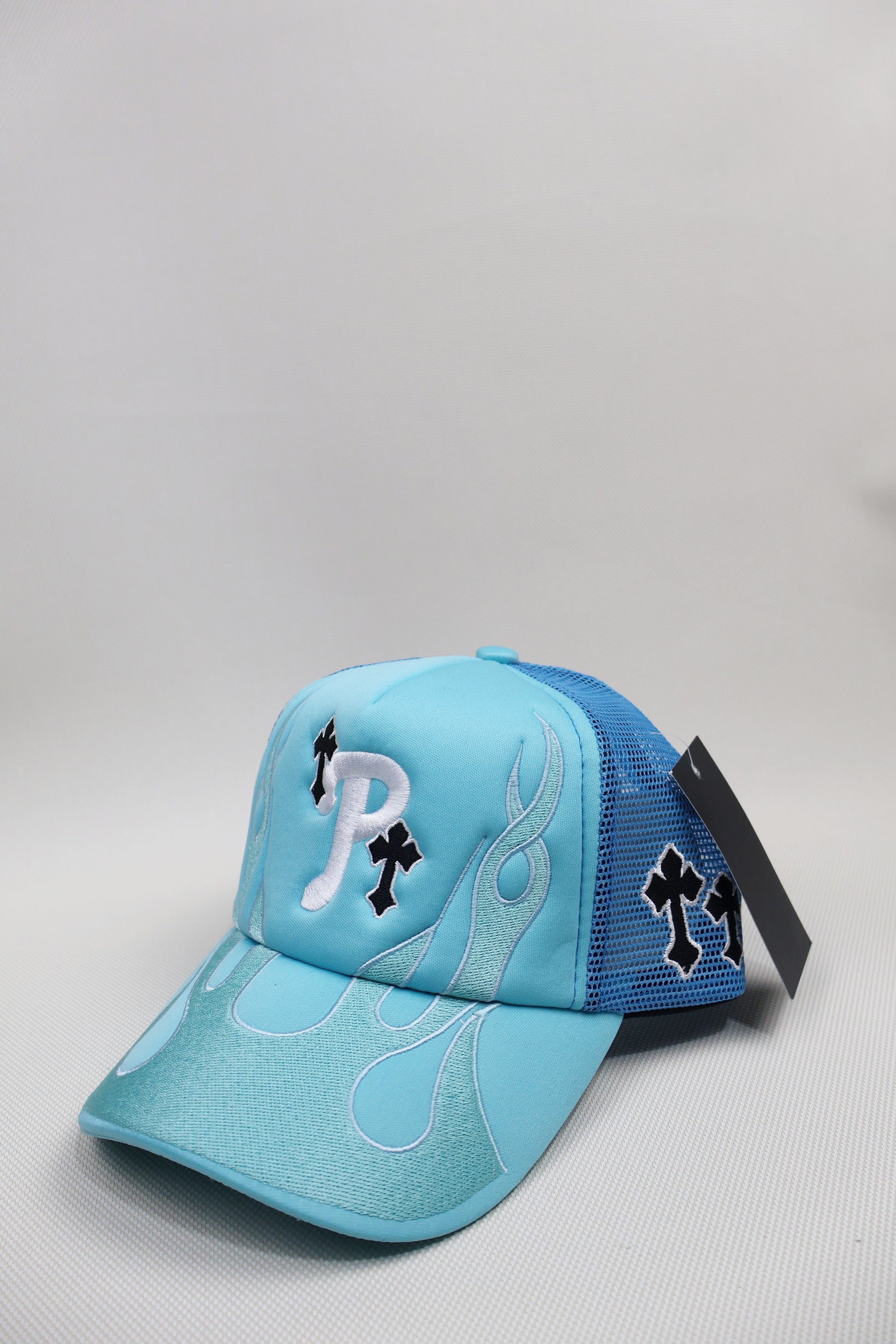 P BABY BLUE FLAMES TRUCKER HAT